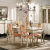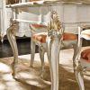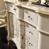 Изящная мебель для гостиной выполнена в классическом стиле из массива дерева. В композицию гостиной входит стол прямоугольный раздвижной, стул с мягкой спинкой и сиденьем, комод с двумя дверцами и выдвижными ящиками разного размера, зеркало и буфет с двумя открывающимися дверями. Модели выполнены в цвете " слоновая кость " с декоративными элементами отделки под старину сусальным золотом и серебром. Декорирована мебель резными элементами ручной работы, что придает гостиной особую роскошь и элегантность.