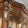 Добротная и шикарная мебель для гостиной выполнена в классическом стиле из массива красного дерева. В композицию входит буфет с двумя дверцами с частично застекленным фасадом и боковинами, обеденный прямоугольный раздвижной стол, стул с мягкой спинкой и сиденьем в текстильной обивке, комод с двумя дверцами запирающими на ключ и выдвижными ящиками разного размера, зеркало - форма рамы выполнена в виде короны. Все модели гостиной декорированы резьбой ручной работы с нанесением сусального золота и серебра.