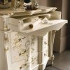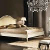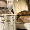 Белая и элегантная спальня выполнена в классическом стиле из массива дерева. В композицию входит двухместная кровать на ножках с высоким мягким изголовьем, прикроватная тумбочка с тремя выдвижными ящиками, комод с тремя выдвижными ящиками и выдвижной панелью для документов или любимой мелочи и большое зеркало. Все модели этой спальни декорированы вручную резными элементами, сусальным золотом и серебром.