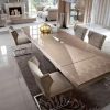 Большой прямоугольный стол – украшение коллекции. Материал шпон дерева клена «птичий глаз» - особый сорт древесины. Стол цвета шампанского предназначен для столовой комнаты. Основа из хромированной стали. Оригинальное декоративное украшение поверхности добавляет столу больше очарования и изысканности.