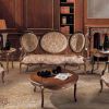 Мягкая мебель для гостиной представлена итальянскими производителями. Трехместный диван и кресла изготовлены на каркасе из древесины с резьбой ручной работы. Обивка - текстиль из ассортимента компании. Подлокотники дополнены мягкими накладными. Модели имеют эксклюзивную форму и великолепный дизайн созданный для классического интерьера.