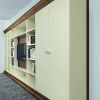 Библиотека очень вместительна. Визуально добавляет помещению больше гармонии и пространства. Стенка состоит из модульных частей, которые возможны в различном оформлении: с открытыми полками, деревянными или стеклянными дверцами. Также очень красиво смотрится оформление дверей в английском стиле. Широкие модули бывают открытые, или служат как пространство для ТВ.
