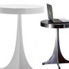 Стильный металлический ночной столик. Модель отличается изящным исполнением ножки, которая составлена композицией из четырех металлических пластин, столешница - круглой формы. Ночной столик представлен в нескольких вариантах цветов и отделки материала - белый, полированный металл, фиолетово-красный. Столик станет изысканным дополнением меблировке спальни.