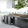 Кухня из коллекции Twenty от итальянско мануфактуры Modulnova. Компактный и невероятно многофункциональный кухонный гарнитур, который, по сути, представляет целый комплекс кухня-столовая-бар. Кухня рассчитана для меблировки столовой, но также для интерьеров в стиле «студия», стилистически лишь украшая гостиную комнату. Рабочая поверхность, где размещены мойка, варочная панель, продолжена ярусом выше столешницей, которая служит столом, роскошной барной стойкой.