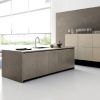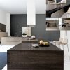 Оригинальный, стильный и эффектный гарнитур для меблировки столовой, кухни, студии. Кухня составлена из модулей, представляющих комоды-шкафы, в том числе оборудованные встроенной бытовой техникой и мойкой, навесные шкафы, обеденным столом, который стильно представлен встроенной в один из модулей столешницей. Kerlite возможно представить, как кухню-столовую, которая при необходимости станет стильной частью меблировки гостиной.