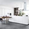 Белоснежная стильная многофункциональная кухня, которая представляет в гарнитуре все необходимые для рабочей и обеденной зон предметы мебели. Столешница рабочего стола выполнена из прочного искусственного камня corian, обеденный стол - массив дерева. Облицовка белыми панелями стола, а также навесных шкафов отличается покрытием с эффектом «шелк», что придает гарнитуру особенный шарм фешенебельности. Открытые конструкции некоторых шкафов создают эффект легкой архитектурной формы.
