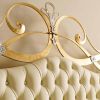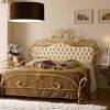 Двухспальная кровать изготовлена ручной работы из кованого железа в классическом стиле. Изогнутые линии изголовья и изножья кровати украшены сусальным золотом, серебряными листьями и вставками кристаллов от Swarovski. Изголовье обито мягкой кожей из ассортимента компании и декорирован стежкой - капитоне, и так же украшено кристаллами от Swarovski.