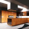 Эффектная фешенебельная кухня из натурального дерева (оливковое), выразительность которой придает отделка алюминиевыми элементами и полированным стеклом темного цвета кофе моко. Из полированного стекла выполнена также и столешница, боковые панели шкафов. Шарм кухне создает светодиодная подсветка под навесными шкафами.
