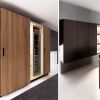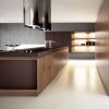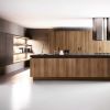 Эстетичный солидный кухонный гарнитур, который украсит не только столовую, или кухню, но и станет достойным продолжением гостиной в студии. Кухня выполнена из ореха, в отделке использованы алюминий, стекло цвета кофе (из него выполнена также и столешница рабочей зоны стола). Навесные шкафы оборудованы, как закрытыми, так и открытыми полками, которые имеют эффектную подсветку.