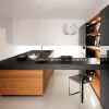 Незаурядный яркий кухонный гарнитур из тика, который представлен, как в натуральном, так и в черном цвете (лакировка). Дерево в гарнитуре сочетается с алюминием, что создает особенный фешенебельный эффект. Стол кухни имеет удобные раздвижные дверцы, шкафы отличаются закрытыми и открытыми полками. Цельная столешница образует как рабочую поверхность стола, так и обеденную зону.