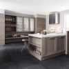 Уникального оттенка кухня, который назван дизайнерами «глина». В этом необычном цвете выполнена облицовка столов и полок, а также навесных шкафов, дверцы которых отличаются использованием стекла с сатиновым матовым напылением. Особенный изыск кухне придают хромированные металлические элементы, гранитная композитная столешница.