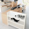 Кухня из лиственницы выполнена в натуральном ее цвете, что придает гарнитуру особенный шарм. Полки и столешница выполнены из ламината (лиственница) с отделкой чуть скругленных краев абс-пластиком. Модули мебели, входящие в гарнитур, подобраны и выполнены в уникальном универсальном дизайне конструкций, чтобы служить не только в качестве рабочей кухонной зоны, но и стать достойным дополнением гостиной. Особенный комфорт и уют гарнитуру придают открытые полочки, напольный маленький стеллаж. Ручки открывания дверец - полированный алюминий.