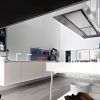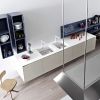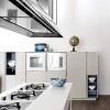 Уютная фешенебельная «легкая» кухня, которая может быть использована в том числе и для обустройства столовой и гостиной. Кухонный гарнитур составлен из белых пепельных столов, выполненных в виде навесных комодов, обеденного стола, а также стильных навесных полочек синего тона, называемого «авиа». Рабочая зона представлена разделочным столом, который также предусматривает встроенное кухонное оборудование.