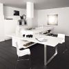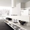 Эффектная и выразительная белоснежная кухня из лакированного дуба. Кухня представлена несколькими отдельными модулями - рабочим столом, обеденной зоной, шкафом со встроенной техникой, но при этом отличается удивительной легкостью архитектурных форм. Рабочий стол с одной стороны оборудован кухонной техникой и размещает разделочную поверхность, с другой - оборудован открытыми полками, при этом он совмещен с обеденным столом в композиции Г-образной формы.