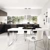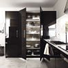 Уникальная «двухсторонняя» кухня, гарнитур которой буквально разделен на две особенные зоны. Из темного лакированного под цвет кофе дуба выполнена рабочая зона кухни, включающая в том числе вместительный шкаф для хранения кухонной утвари. Вторая сторона гарнитура - белоснежный лакированный дуб, из которого выполнен изящный шкаф-стенка с открытыми полками, обеденный стол. Эффектная кухня для столовой и гостиной-студии.