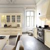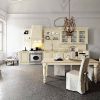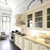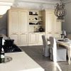 Аристократичный кухонный гарнитур для роскошной столовой, изысканной гостиной. Кухня выполнена из бука с эффектной обработкой методом спаццолато, в данном случае - с легким золотистым эффектом по всей поверхности. Белая лакировка дополнительно изящно подчеркнута золотистой окантовкой, образующей очаровательный декор. Фешенебельный гарнитур представлен рабочими столами со столешницами из полированного матового мрамора, шкафом-буфетом, навесными шкафчиками с дверцами из закаленного стекла.