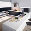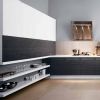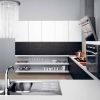 Кухонный гарнитур П-образной формы, которая обеспечивает удобный доступ ко всем рабочим зонам, кроме того, позволяет разместить внутри «островка» комфортную обеденную зону. Кухня выполнена из натурального дуба в двух цветах - лакировка серым матовым тоном и белоснежным цветом, которые в сочетании придают ей штрих респектабельности.