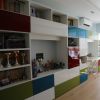 Стеллаж для библиотек, кабинетов и детских. Со встроенным рабочим столом. Имеет открытые полки и ниши с дверками, в глянцевом лаке разных цветов. По индивидуальному проектированию, учитывая размеры помещения заказчика.