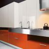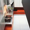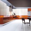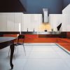 Яркая и оригинальная современная кухня, которая рассчитана для меблировки не только столовой и, непосредственно, самой кухни, но и обустройства неординарного проекта студии. Цветовая гамма включает сочетание светло-бежевого тона с оранжевым цветом папайи, которыми выполнены глянцевые поверхности дверец шкафов и столов. Эффектность дизайну придают алюминиевые поверхности и элементы из нержавеющей стали, которые задают стилю модерн нотки хай-тек.