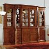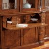 Выразительный внушительный фешенебельный буфет для столовой. Эффектный буфет отличается глубоким цветом махогон, элегантными плавными линиями, оригинальным исполнением дизайна выдвижных ящиков в форме полукруга. Нижняя часть буфета занята под вместительный комод с закрытыми деревянными, верхняя часть - изящные полки за стеклянными дверцами. Уникальность буфета - в наличии секретера (на фото).