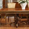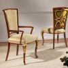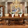 Фешенебельный и роскошный гарнитур для меблировки столовой. Гарнитур состоит из витрин-пеналов со стеклянными дверцами и инкрустацией резными позолоченными элементами, а также обеденного стола и стульев. Обеденный стол отличается эффектной большой прямоугольной столешницей с ярким декором золотистыми виньетками по краю и орнаментальной отделкой поверхности. Стулья в гарнитуре предложены как с подлокотниками, так и без них.