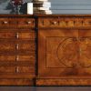 Эффектный комод для размещения в столовой, спальне, гостиной. Комод имеет полки за распахивающимися дверцами, которые расположены в центре, 10 выдвигающихся ящиков, расположенных по обеим бокам и один выдвижной ящик по центру. Модель отличается изысканным орнаментальным декором всей поверхности, инкрустацией резными элементами, ручки ящиков и дверец выполнены по состаренную бронзу.