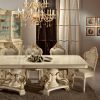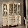 Столовый гарнитур в изящном стиле ампир. Мебель в гарнитуре выполнена в изящном цвете айвори, изысканность которого подчеркивает золотистый декор. В гарнитур, предметы мебели которого возможно заказать отдельно, входит: прямоугольный обеденный стол, стулья (без подлокотников, а также с подлокотниками), а также эффектный сервант с ярким декором резными элементами и дверцами из стекла.