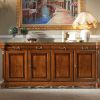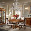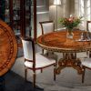 Роскошный набор мебели для создания выразительного дизайна в стиле барокко в столовой. Гарнитур включает круглый обеденный стол с эффектной скульптурной ножкой и отделкой орнаментом поверхности и золотистыми виньетками по краю, витрину со стеклянными боковыми панелями и дверцами, стулья и комод. Мебель представленного гарнитура возможно заказать и приобрести по-отдельности.