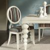 Гарнитур для столовой из стульев и обеденного стола в ярком стиле модерн, ретро. Стол в гарнитуре отличается оригинальным дизайнерским исполнением ножек, столешница - цельная прямоугольная. Цвет стола - белый снег, матовая полировка. Стулья отличаются высокими спинками в виде круга с мягкой вставкой и обивкой, как и мягкое сиденье, яркой полосатой тканью в стиле ретро.