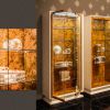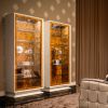 Элегантная роскошная витрина со стеклянными распахивающимися дверцами. Внешняя конструкция витрины выполнена в белом цвете, внутреннее пространство эффектно представлено отделкой под мрамор янтарного цвета. Полки витрины (пять штук) - тонкое закаленное стекло, в модели предусмотрена внутренняя подсветка (вверху). Витрина станет украшением не только гостиной и столовой, но и делового кабинета.
