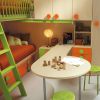 Мебель для детской комнаты из натурального клена. Гарнитур выполнен в выразительном зеленом цвете, который ярко подчеркнут оранжевыми элементами и панелями натурального цвета клена. Детская представлена двухъярусной кроватью, комодом с ящиками, навесными шкафами, платяным шкафчиком, а также удобным рабочим местом со столом с фигурной столешницей.