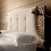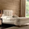 Кровать двуспальная с оригинальным дизайном и декором высокого изголовья. Являясь основной изюминкой дизайнерской мысли, изголовье сочетает декор резными элементами, а также изысканную мягкую обивку, выполненную эффектным каретным методом. Кровать стоит на низких фигурных ножках в форме пирамидок. Модель сочетает в себе несколько стилевых решений и прекрасно подчеркнет меблировку в стилях классики, рококо, антик и ампир.