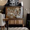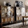Незаурядная элегантная выразительная витрина, которая станет эффектным выбором для меблировки столовой, гостиной. Витрина представлена нижним закрытым комодом с двумя большими выдвижными ящиками, шкафом со стеклянными открывающимися дверцами, декорированными абстрактным узором белого тона. Полки витрины - из ударопрочного стекла.