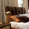 Изумительного дизайна двуспальная кровать с оригинальным исполнением изголовья. Изголовье кровати имеет мягкую обивку, разделенную на три элемента, основание - деревянная планка с резным фигурным узором. Мягкая обивка также использована и по периметру каркаса кровати. Модель оснащена низкими ножками оригинальной телескопической формы.