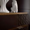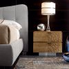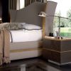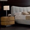 Прикроватная тумбочка представлен отдельно моделями, которые устанавливаются слева и справа у кровати. Различия тумбочек в расположении резного узора, который расположен с одной стороны сбоку фасада моделей. Тумбочки оснащены двумя выдвижными ящичками, стоят на одной широкой металлической квадратной ножке, которая придает дизайну тумбочек штрих оригинальности.