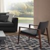 Темпераментного дизайна стул с подлокотниками. Каркас модели выполнен из дерева, мягкое сиденье и спинка обтянуты высококачественной эластичной тканью, подлокотники деревянные. Стул-кресло отличается легкостью архитектурной формы и визуально не загромождает пространство. Отличный выбор для меблировки современной гостиной, веранды загородного дома.