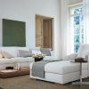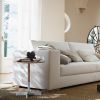 Диван с мягкой комфортной обивкой представлен, как модульная композиция. Наполнителем обивки выбран вспененный полиуретан (различной плотности в разных частях), при этом подушки сиденья составляют комбинированный наполнитель из волокна и перьев. Обивка может быть предложена, как текстильная, так и роскошная кожаная. Ножки низкие, квадратные - из дерева. Из дерева выполнен и каркас модели.