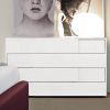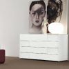 Комод для меблировки стильной спальни. Модель отличается не только комфортом вместительных ящиков, открывание которых осуществляется, благодаря амортизаторам, плавно, но и оригинальностью дизайна передних панелей. Отделка комода выполнена шпоном ясеня с отделкой белым матовым, либо глянцевым цветом. Модель располагает четырьмя ящиками.