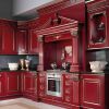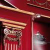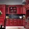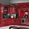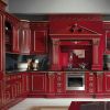 Яркая эффектная кухня, которая отличается выразительным декором резными элементами и роскошным цветом, сочетающим изысканный бордо и золотистый декор. Кухня - угловая, составлена в виде гарнитура из шкафов, навесных шкафчиков, рабочих столов, эффектного вытяжного шкафа, который украшает стол с варочной панелью. Яркая кухня станет истинным украшением интерьера Вашей квартиры, или роскошного загородного дома.