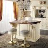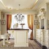 Потрясающий кухонный гарнитур, который создает очень красивую и роскошную меблировку в кухне, превращая ее, отчасти, в столовую. В гарнитуре представлены тумбочки и столы рабочей зоны, отдельно стоящие шкафы со встроенной бытовой техникой. Кухня - в белом цвете с очень красивым золотистым декором резных украшений, а также отделкой золотистыми планками стеклянных дверец шкафов. Отдельно стоящий стол кухни оборудован небольшой барной стойкой.