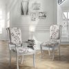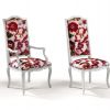 Стул с подлокотниками и стул с высокой спинкой для гостиной или столовой в классическом итальянском стиле. Каркас из массива дерева украшен резьбой, выполненной вручную, окрашен белой краской и покрыт лаком, обивка из высококачественного текстиля белого или красного цвета с рисунком.