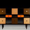 Оригинальная и очень эффектная в современном стиле этажерка с полками за открывающимися дверцами, а также выдвижными ящиками. Этажерка комбинирует черный цвет с шоколадным, обивка панелей ящиков - оранжевая. Модель представлена в двух вариантах. Первый предусматривает три яруса ящиков (9 дверей 4 ящика), второй - два яруса (6 дверей 2 ящика)