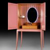Стильный и романтичный туалетный столик для эффектной леди. Модель выполнена из натурального дерева, очень функционально оборудована внутри: 4 коробки для украшений, 1 ящик, 2 полки. Кроме того, за дверцами скрывается удобное овальное зеркало с локальным освещением. Нежно-розовый цвет и золотистая краска в отделке придают столику эффект романтизма и винтажности.