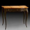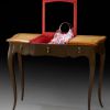 Эффектная, в очень темпераментом парижском стиле туалетный столик. Модель оснащена двумя ящиками, расположенными по бокам, в центре - особенное решение - открывающаяся столешница, которая создает эффектный столик для макияжа. Центральная часть столешницы изнутри имеет зеркало, внутреннее пространство колоритно выкрашено в цвет фуксии. Консоль из липы, отделка - вишня. Цвет - шоколад.