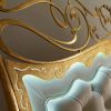 Каркас кровати изготовлена из кованого железа. Конструкция изогнутых линий изголовья и изножья кровати украшены сусальным золотом и серебром и декорирован искусственным состариванием. Роскошная панель изголовья выполнена в обивке из кожи и оформлена стежкой - капитоне. Дизайн кровати придает светодиодное освещение, что радует своей красотой и необычностью. Модель выполнена в классическом стиле.