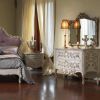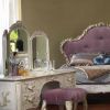 Королевская мебель для спальной комнаты придет по душе самым требовательным покупателем. Роскошная кровать с мягким изголовьем украшена пышным покрывалом. Туалетный столик с тройным зеркалом украшен мягким пуфиком. Кроме этого в комплекте имеется комод, большое зеркало и прикроватные тумбочки.