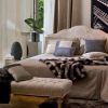 Каркас из дерева и крашеной стали с деревянными ламелями, покрытыми хлопковой тканью цвета небеленого полотна. Кар- кас основания полностью разбирается, чтобы обеспечить минимальные габаритные размеры при транспортировке. Ножки предлагаются трех разных видов, показанных рядом: полированные орехового цвета или в декапированной отделке. Воз- можность установки автоматической сетки. Набивка каркаса из пенопласта и волокна, пропитанного специальными смолами, в соединении с трикотажным хлопковым полотном. Полностью съемная обивка. Трафаретное украшение ручной штамповки предлагается только для двуспальной кровати.