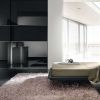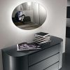 Невероятно современный комплект для спальни, выполненный в темно-сером лаке. Кровать с жестким изголовьем в стиле «минимализм» прекрасно гармонирует с низкими прикроватными тумбами круглой формы того же цвета. Высокий комод необычного дизайна покрыт темным лаком и дополнен овальным зеркалом без рамы.
