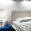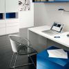 Ультраяркий набор для спальни от Mercantini сочетает в отделке сочный глянцевый синий и белый матовый. Кровать с мягким изголовьем, обитым материей светлого цвета. Низкие прикроватные тумбочки на колесиках покрыты ярким глянцевым лаком. Также в комплект входит стол с подкатной тумбой и кресло в современном стиле на высоких металлических ножках.