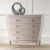 Комод изогнутой трапециевидной формы изготовлен из массива дерева в окрашенной обработке. Низ изделия украшают фигурные ножки и резные симметричные элементы. Ручки комода инкрустированы кристаллами Swarovski.
